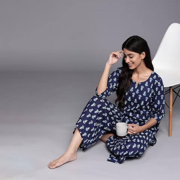 0 review(s) for "Women Navy Blue & White Printed Night suit"